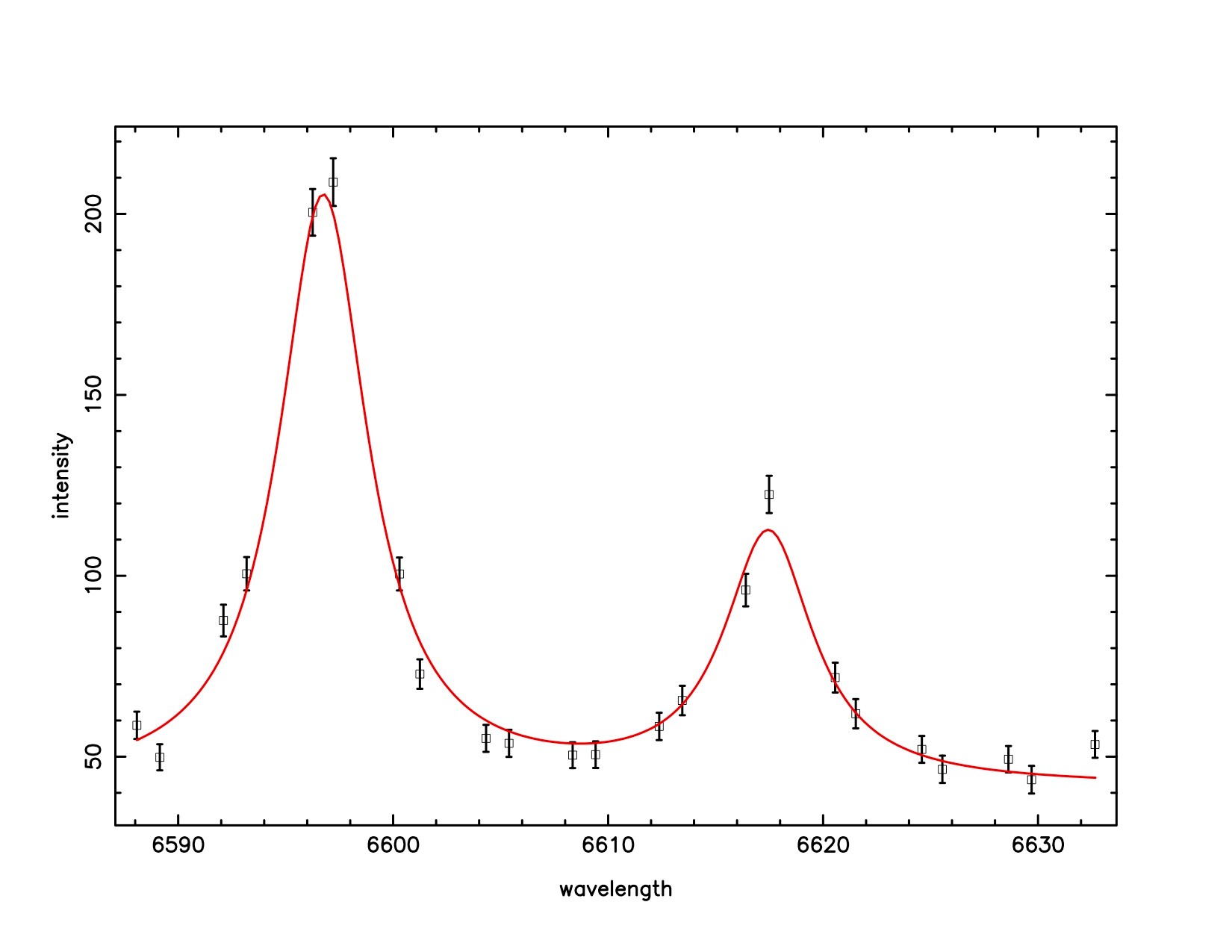 A Fabry-Pérot interferometer is essentially a tunable filter that produces a narrow-band image at one or a series of wavelengths that you specify.  SALT has three etalons (the optical part of the Fabry-Pérot) that can give spectral resolutions of 300, 600, 1500, or 9000 over the wavelength range of 430 to 900 nm covering the entire 8 arc-minute diameter field of view of the RSS.  A typical observing program takes a series of images covering a 2 to 4 nm spectral range of interest for the particular target.  Figure 1 below shows an example of FP data of the Ha emission of the galaxy NGC 1325, taken on 02 November 2011 in the medium resolution (R 1500) mode.  The upper left panel is taken at central wavelength 659.7 nm, the upper right at 660.1nm, and the lower left in nearby continuum at 663.1 nm; exposures are 90 seconds each.  You can see the effect of the galaxy’s rotation, Doppler shifting the emission of the HII regions.  The velocity map of the galaxy, generated by fitting all 23 images in the series, is shown in the lower right panel.  A sample spectrum of one of the HII regions is shown in Figure 2, with fits to the Ha and [NII] lines.  There are over 10,000 such spectra measured in the data cube, extending to a radial distance of more than 12 kpc (40,000 light-years) from the center of the galaxy.