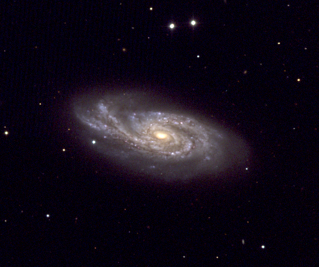 This RGB image is a combination of 10 second exposures taken in red, green and blue filters on the Southern African Large Telescope (SALT) during November 2016. No image processing was done beyond the combination and scaling of the different colours (see raw images below). Such an image will show far more detail if longer exposures are made, but even in these extremely short exposures, the galactic nucleus is clearly visible together with dust lanes that extend along the bar to the spiral arms.