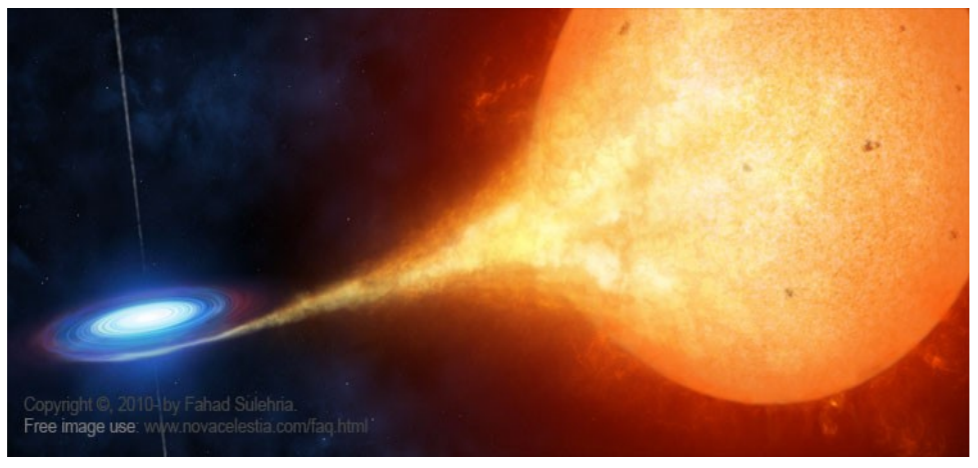 There are stellar mass black holes that are in binary pairs with companion stars. See the illustration for an artist’s impression of such a system where the yellow/orange star is the companion. Material flows from it’s surface toward the black hole (which is infinitely small and therefore invisible) and because they are orbiting around each other, the material swirls like water draining from a bathtub as it plunges down the gravitational well that the black hole creates in space. The in-spiralling material releases photons with increasing energy (coloured red, then blue and eventually white) as it moves ever closer to the black hole. We call this an accretion disc because material is being accreted into the black hole, thereby growing it in mass while the companion loses mass. When a large amount of mass is transferred in this way the system can become a microquasar, launching extremely energetic jets perpendicular to the accretion disc and increasing it’s brightness dramatically. These systems are also known as Black Hole binary systems.