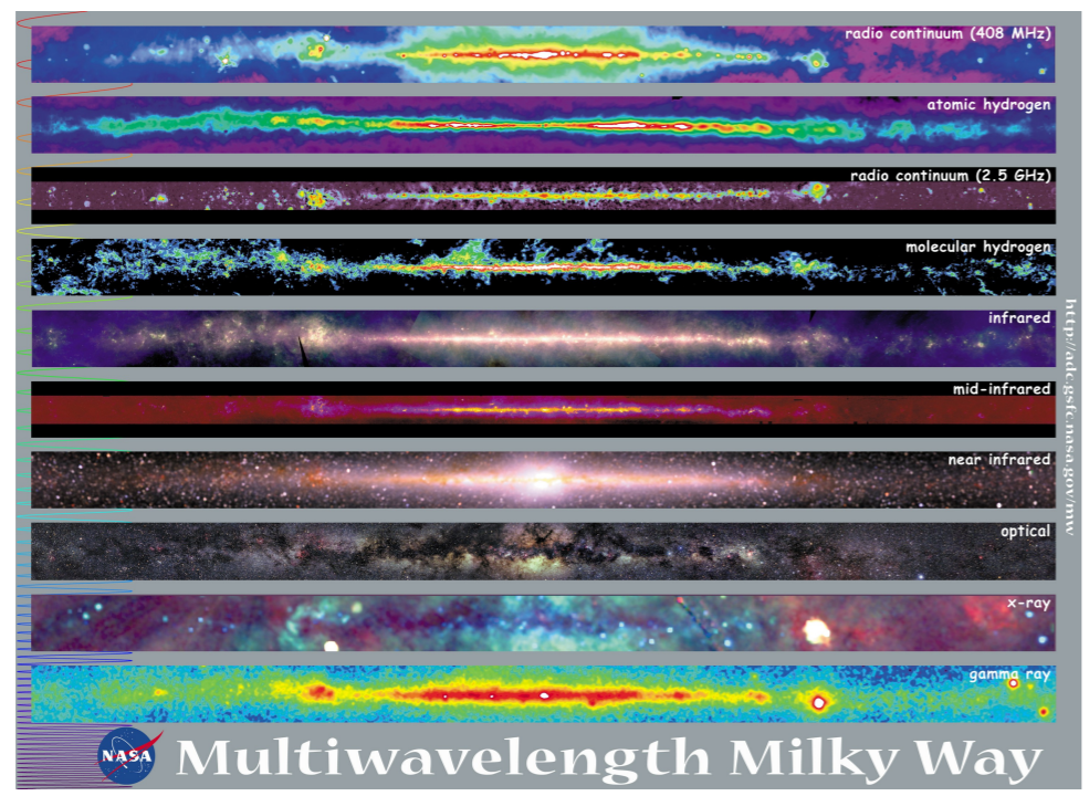 The illustration above shows our own galaxy in a variety of wavelengths. See the descriptions in the top right of each individual image to know in which wavelength range each was observed. It starts with a low energy (long wavelength) range and increase in energy as you move downwards through the images.