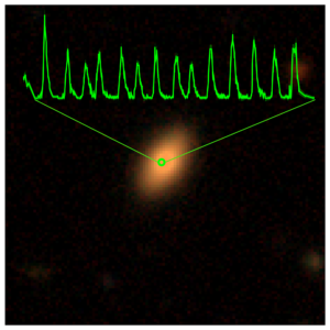 Optical image of the first galaxy found with quasi-periodic eruptions in the eROSITA all-sky data, the NICER X-ray light-curve is overlayed in green. The galaxy was identified as 2MASS 02314715-1020112 at a redshift of z~0.05, determined by SALT. The peak-to-peak separation of the X-ray outbursts is about 18.5 hours. Credit: MPE; optical image: DESI Legacy Imaging Surveys/D. Lang (Perimeter Institute)