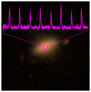 Optical image of the second galaxy found with quasi-periodic eruptions in the eROSITA all-sky data, the XMM-Newton X-ray light-curve is overlayed in magenta. The galaxy was identified as 2MASX J02344872-4419325 at a redshift of z~0.02, determined by SALT. This source shows much narrower and more frequent eruptions with a mean peak-to-peak separation of only about 2.4 hours. Credit: MPE; optical image: DESI Legacy Imaging Surveys/D. Lang (Perimeter Institute)