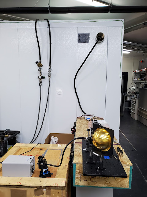 The light feed system was also set up on an ad hoc lab bench (that closely resembles a particle board box!). The light source on the left feeds a liquid light guide that plugs into the gold-coloured integrating sphere before entering the TIC.
